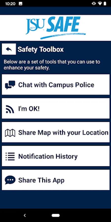 JSU SAFE is the official safety app of Jackson State University. It is the only app that integrates with JSU's safety and security systems. Campus Police has worked to develop a unique app that provides students, faculty and staff with added safety on the JSU campus. The app will send you important safety alerts and provide instant access to campus safety resources.