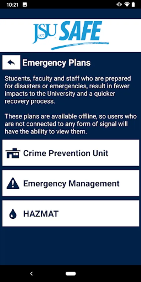 - Emergency Plans: Campus emergency documentation that can prepare you for disasters or emergencies. This can be accessed even when users aren’t connected to Wi-Fi or cellular data.