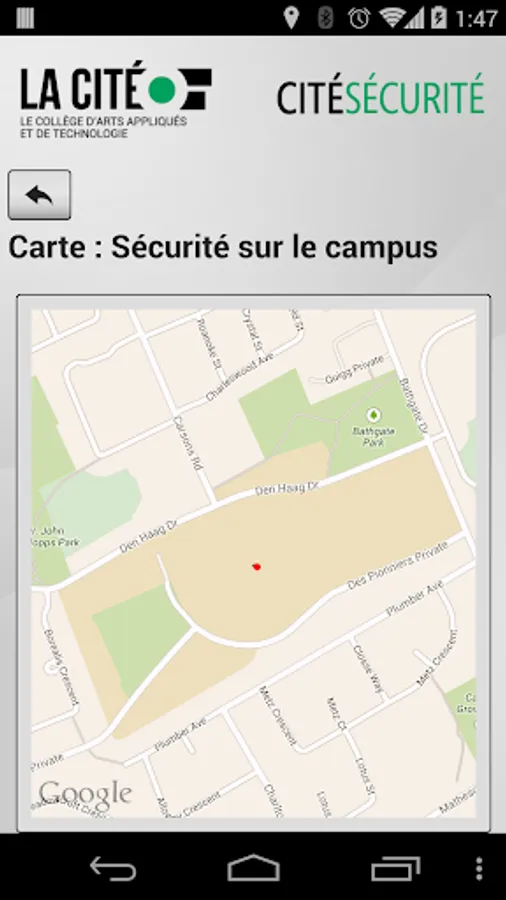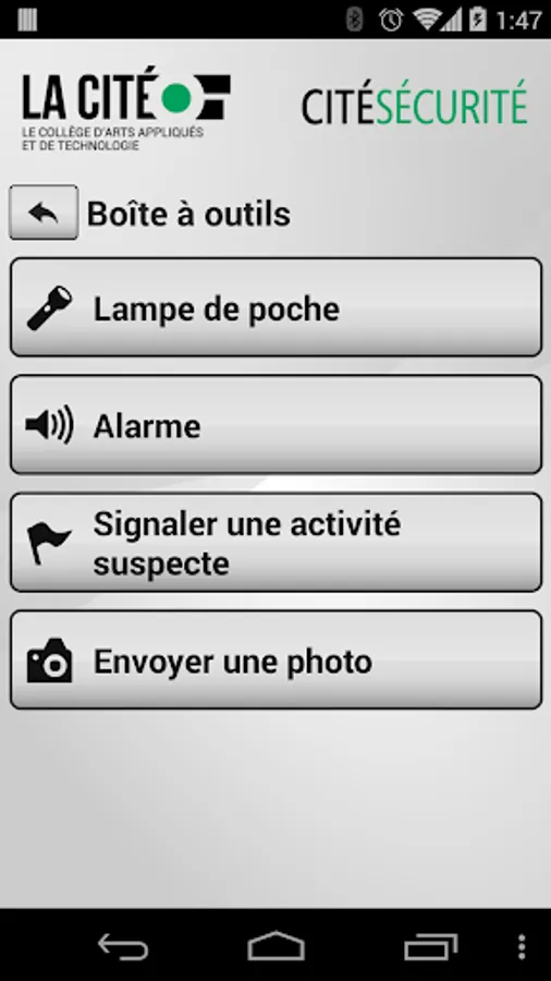 Cité Sécurité a été développée par le Service de sécurité du campus à La Cité en vertu de son mandat d'élaborer des politiques, programmes, services et ressources d'information pour veiller à la sécurité des étudiants. L'application comprend des outils, de l'information et des ressources pour les étudiants.
