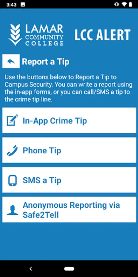 - Tip Reporting: Multiple ways to report a safety/security concern directly to Lamar Community College security.