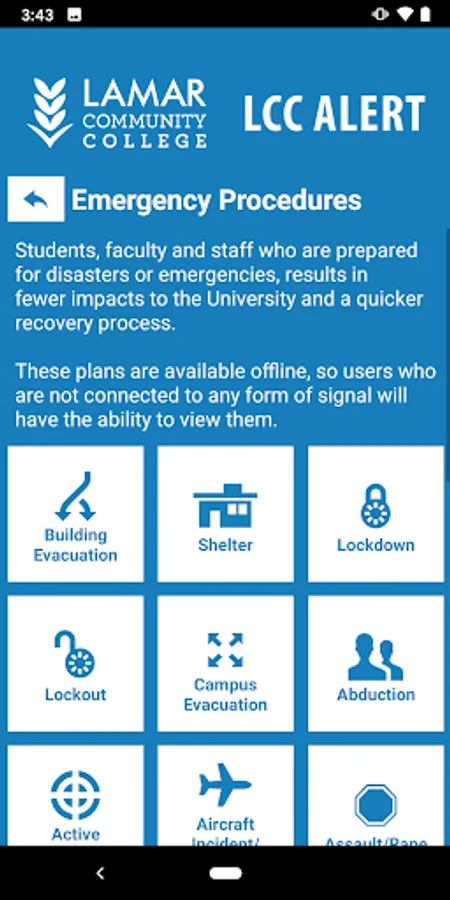 - Emergency Procedures: Campus emergency documentation that can prepare you for disasters or emergencies. This can be accessed even when users aren’t connected to Wi-Fi or cellular data.