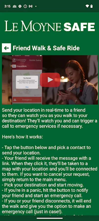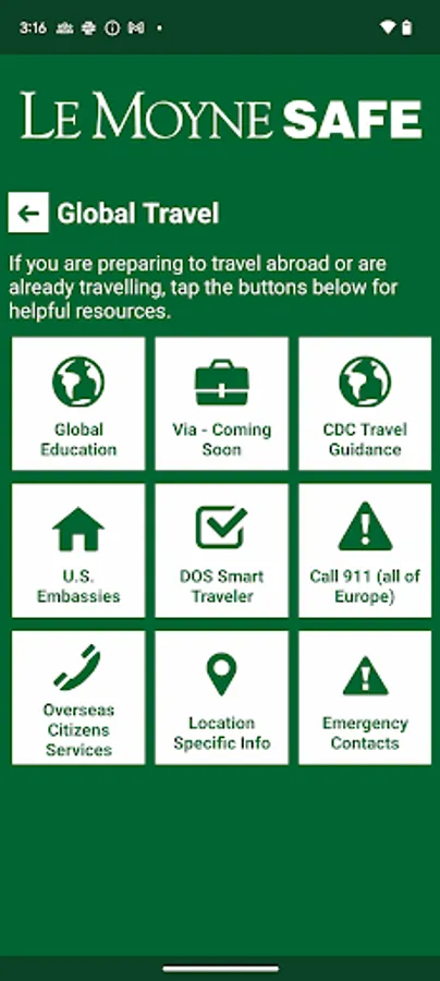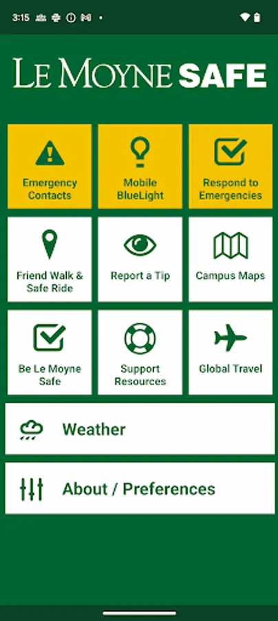 Le Moyne Safe is the official safety app of Le Moyne College. It is the only app that integrates with Le Moyne College's safety and security systems. Campus Safety has worked to develop a unique app that provides students, faculty and staff with added safety on the Le Moyne College campus. The app will send you important safety alerts and provide instant access to campus safety resources.