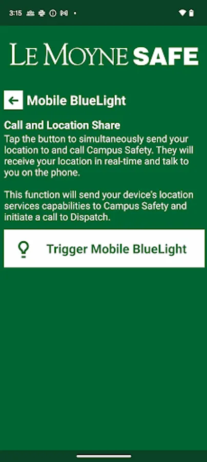 - Panic Button / Mobile Bluelight: Send your location to Le Moyne College security in real-time in case of a crisis