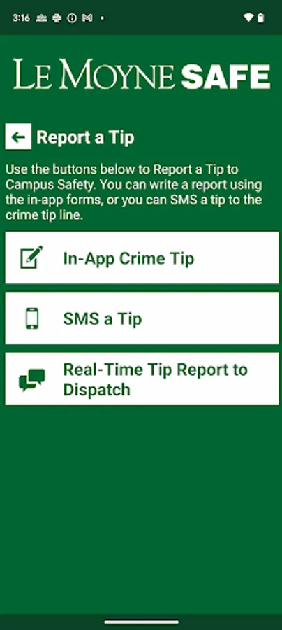 - Tip Reporting: Multiple ways to report a safety/security concern directly to Le Moyne College security.