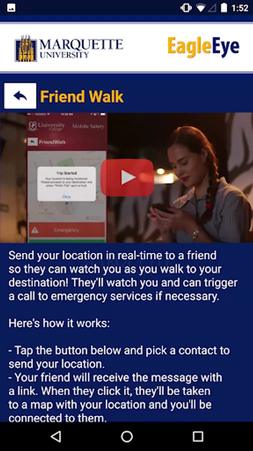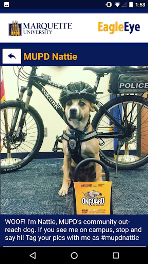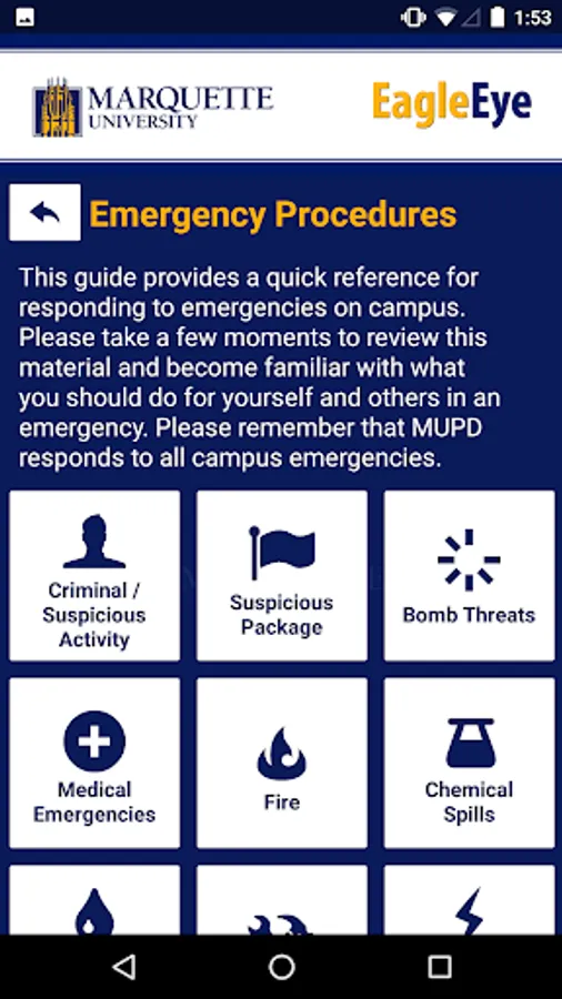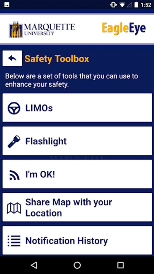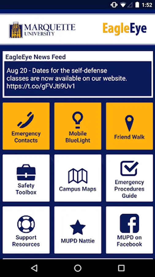 EagleEye is the official safety app of Marquette University. It is the only app that integrates with Marquette University's safety and security systems. Marquette University Police Department has worked to develop a unique app that provides students, faculty and staff with added safety on the Marquette University campus. The app will send you important safety alerts and provide instant access to campus safety resources.