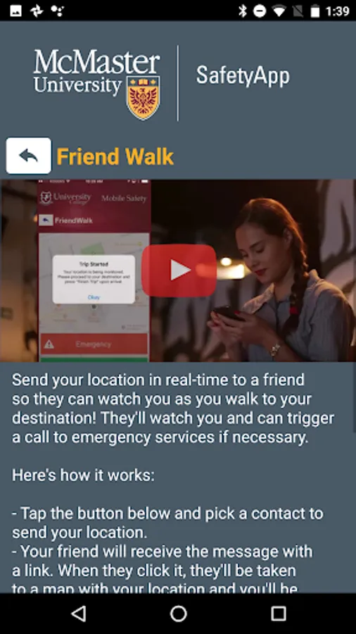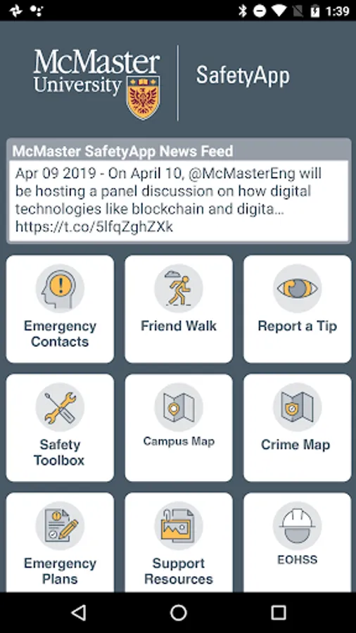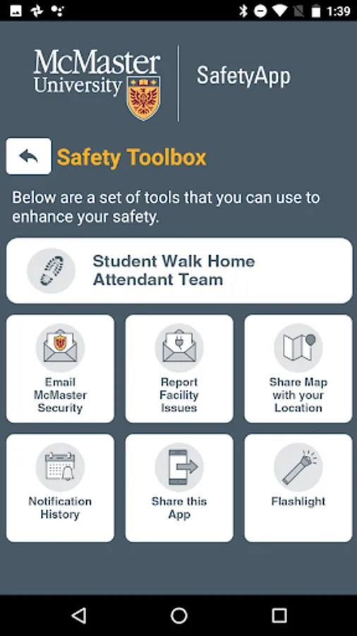 McMaster SafetyApp is the official safety app of McMaster University. It is the only app that integrates with McMaster's safety and security systems. McMaster University has worked to develop a unique app that provides students, faculty and staff with added safety on the McMaster campus. The app will send you important safety alerts and provide instant access to campus safety resources.