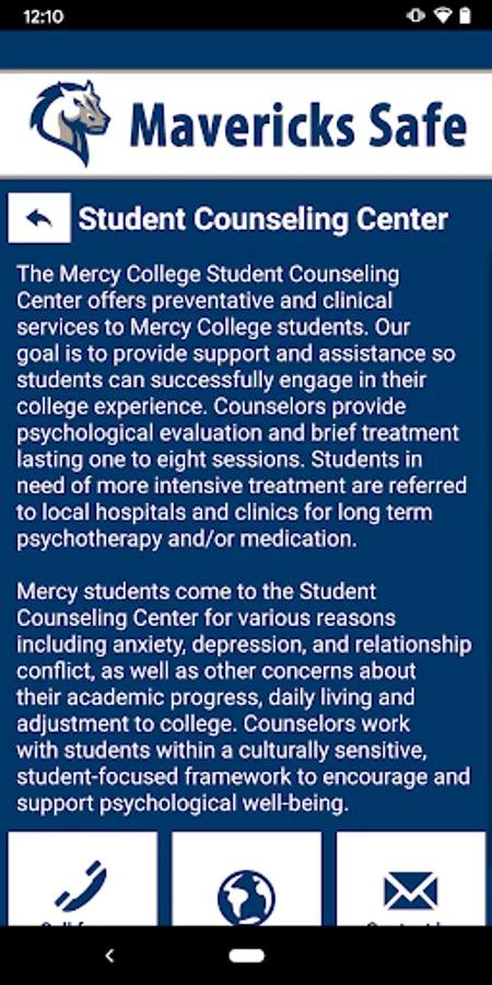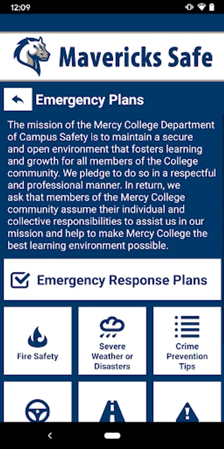 Mavericks Safe is the official safety app of Mercy University. It is the only app that integrates with Mercy University's safety and security systems. Campus Safety has worked to develop a unique app that provides students, faculty and staff with added safety on the Mercy University campus. The app will send you important safety alerts and provide instant access to campus safety resources.