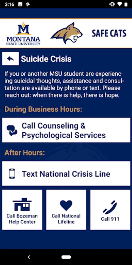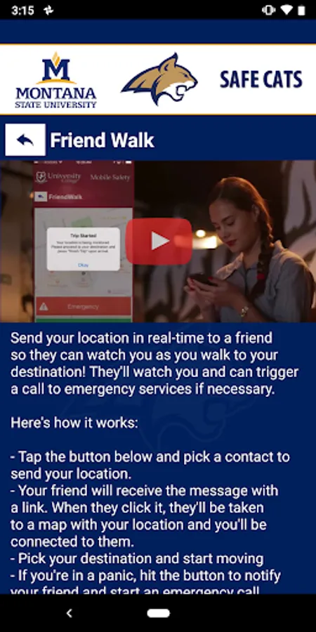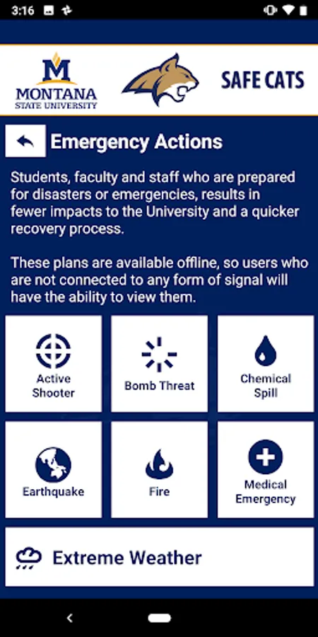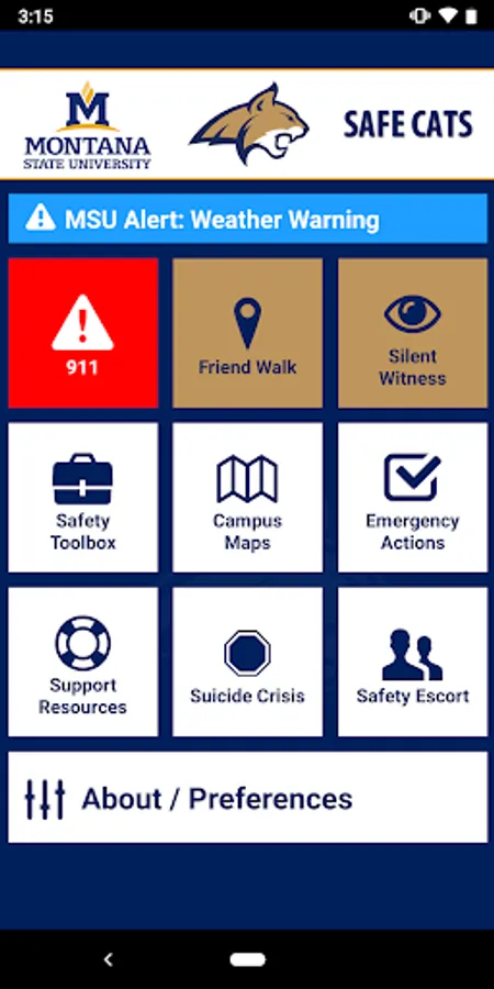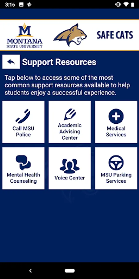 Safe Cats is the official safety app of Montana State University. It is the only app that integrates with MSU's safety and security systems. The MSU Police has worked to develop a unique app that provides students, faculty and staff with added safety on the Montana State University campus. The app will send you important safety alerts and provide instant access to campus safety resources.