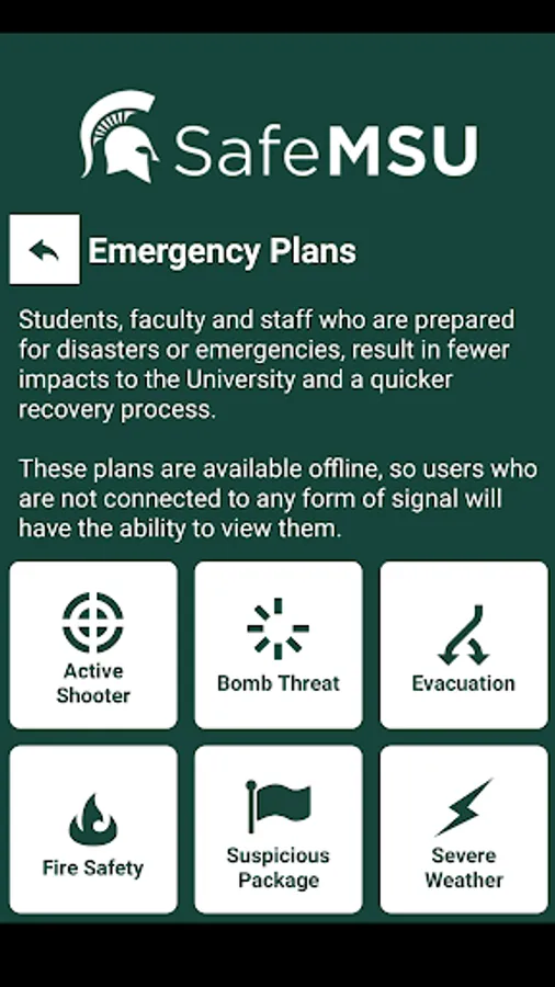 - Emergency Plans: Campus emergency documentation that can prepare you for disasters or emergencies. This can be accessed even when users aren’t connected to Wi-Fi or cellular data.
