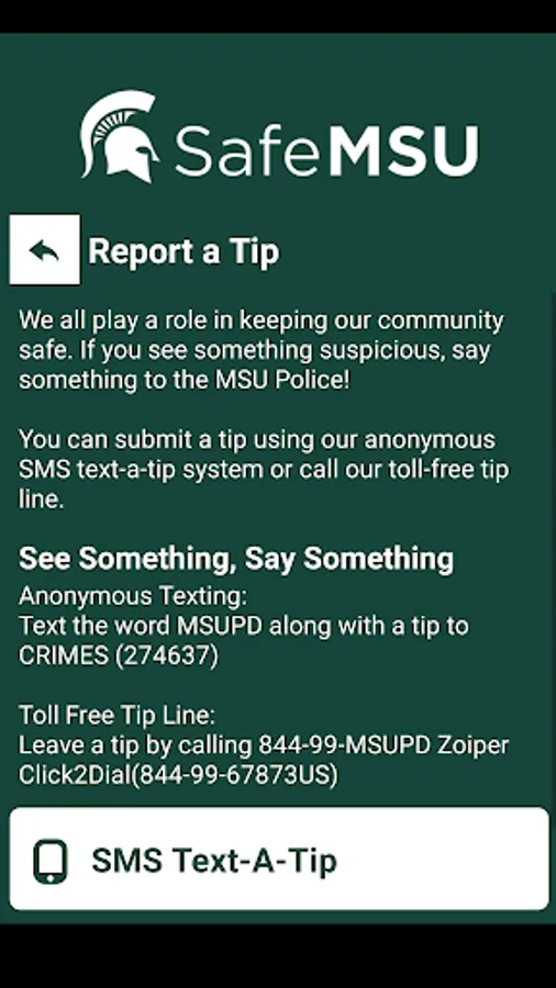 - Tip Reporting: Multiple ways to report a security concern directly to Michigan State University security.