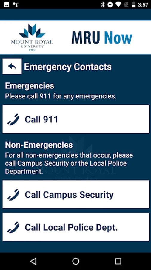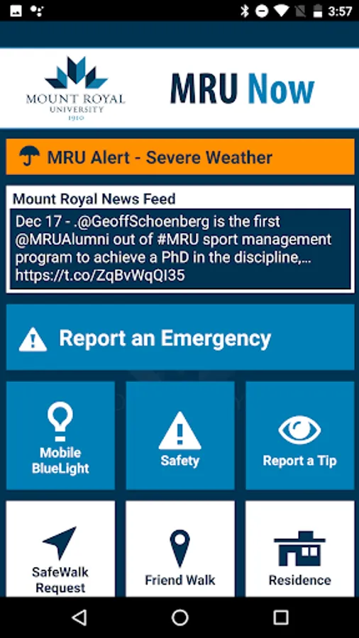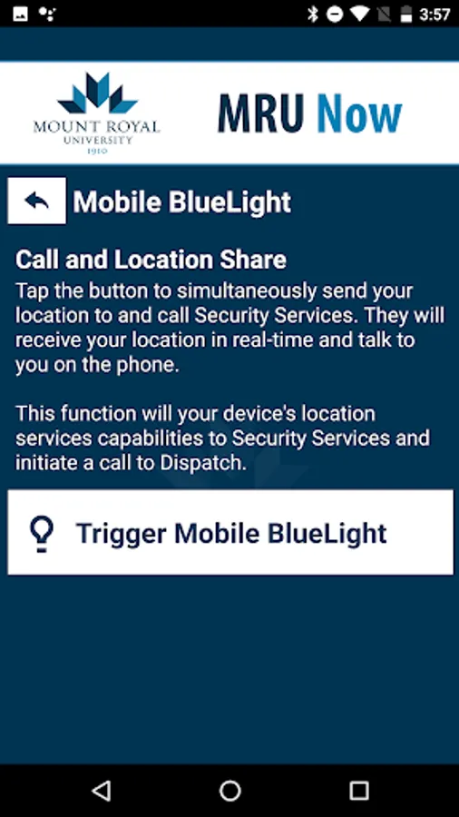 - Mobile Bluelight: Send your location to Mount Royal University security in real-time in case of a crisis