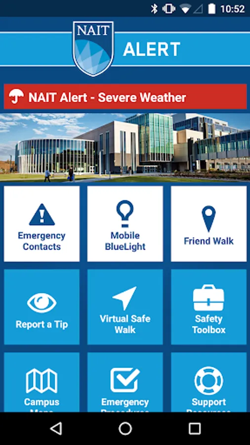 NAIT Alert is the official safety app of Northern Alberta Institute of Technology. It is the only app that integrates with NAIT's safety and security systems. NAIT has worked to develop a unique app that provides students, faculty and staff with added safety on the NAIT campus. The app will send you important safety alerts and provide instant access to campus safety resources.
