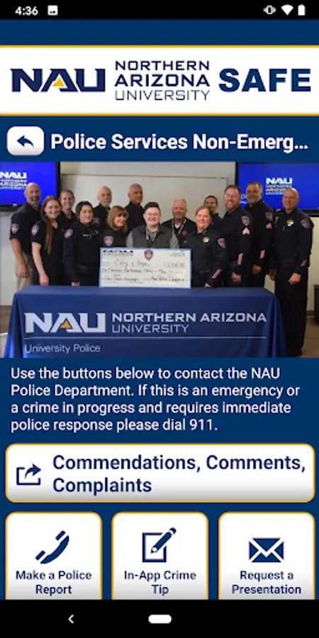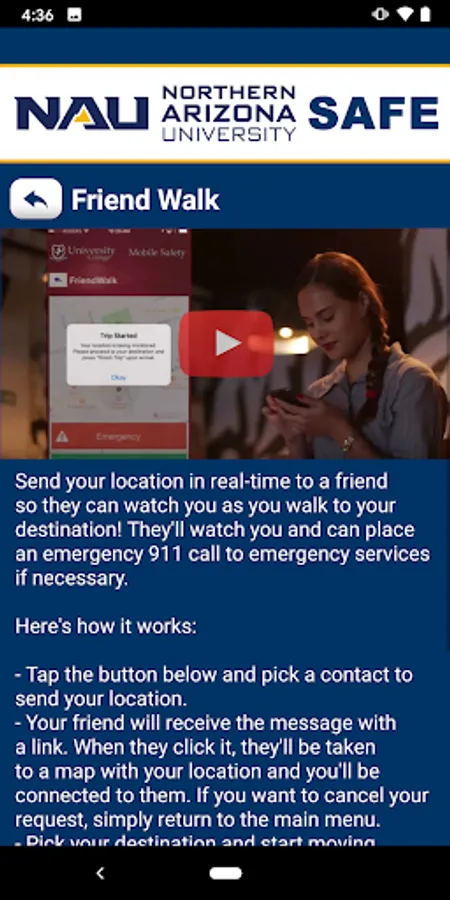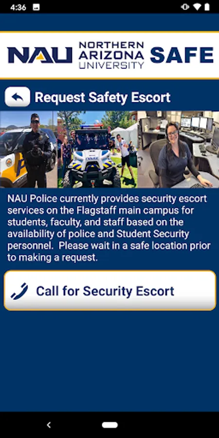 NAU SAFE is the official safety app of Northern Arizona University. It is the only app that integrates with NAU's safety and security systems. The NAU Police Department has worked to develop a unique app that provides students, faculty and staff with added safety on the NAU campus. The app will send you important safety alerts and provide instant access to campus safety resources.