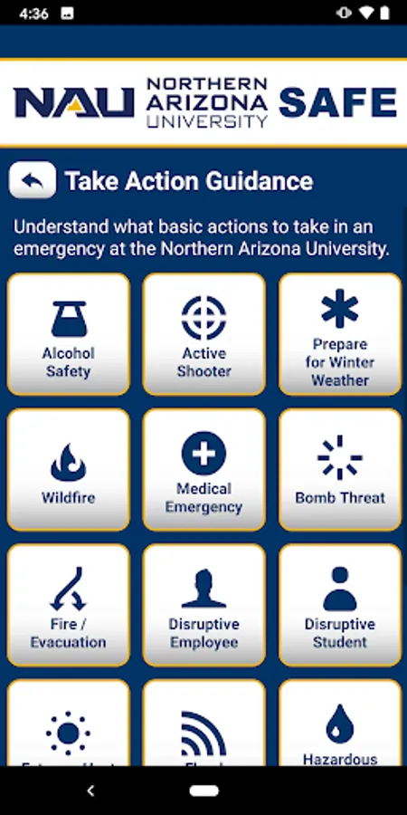 - Take Action Guidance: Campus emergency documentation that can prepare you for disasters or emergencies. This can be accessed even when users aren’t connected to Wi-Fi or cellular data.