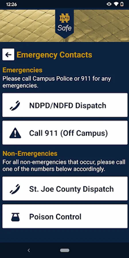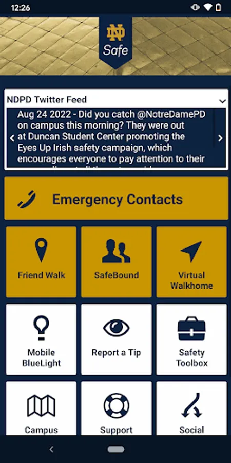- Safety Notifications: Receive instant notifications and instructions from University of Notre Dame safety when on-campus emergencies occur.