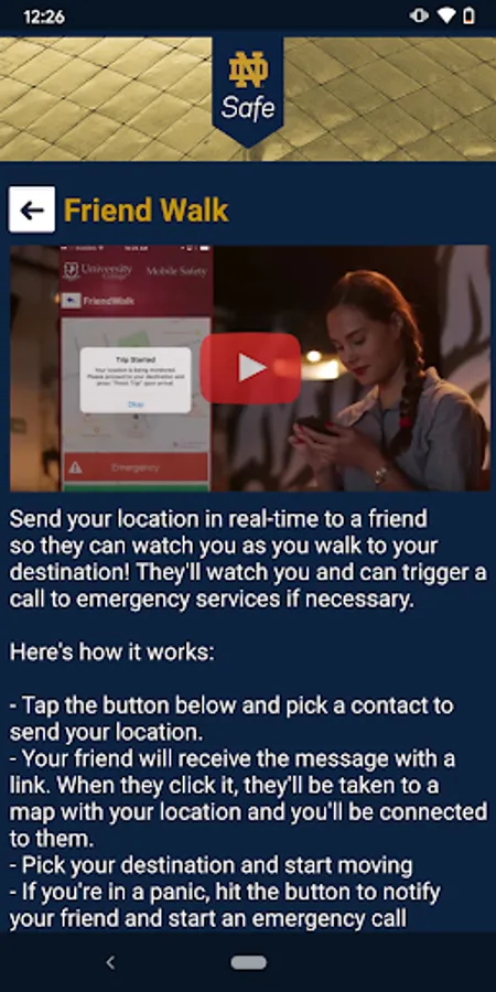 - Virtual WalkHome: Allow NDPD to monitor a user’s walk. If a user feels unsafe when walking on campus, they can request a Virtual WalkHome and a dispatcher on the other end will monitor their journey until they reach their destination.