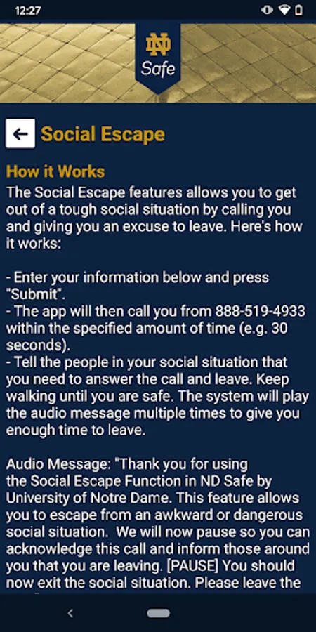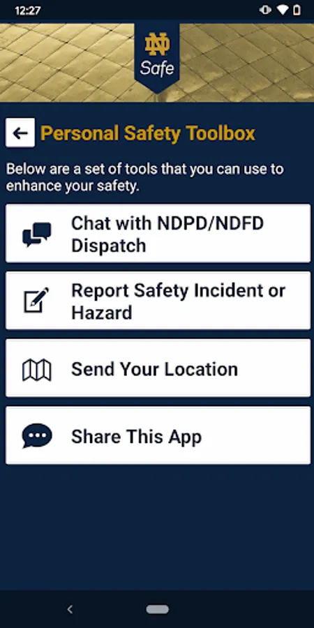 - Chat with Security: Communicate live with safety staff at University of Notre Dame via chat.