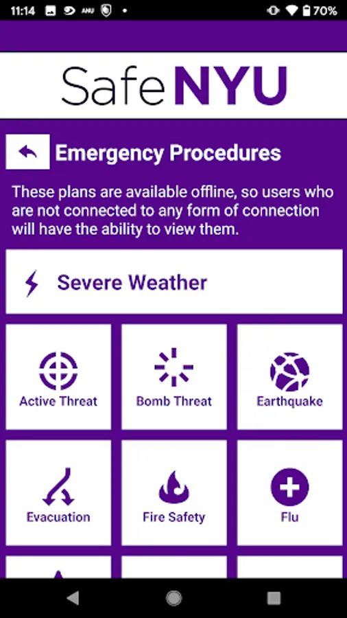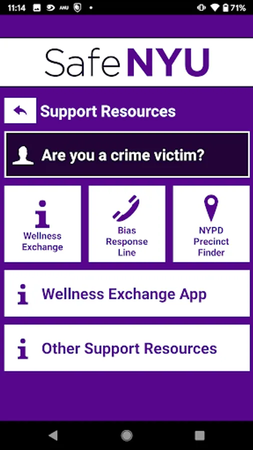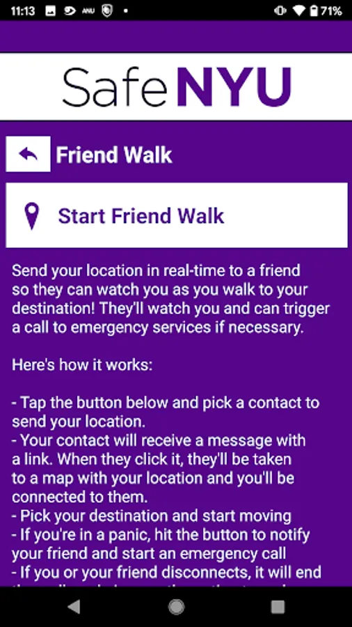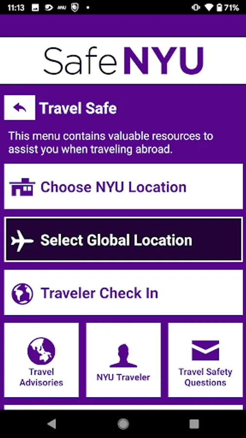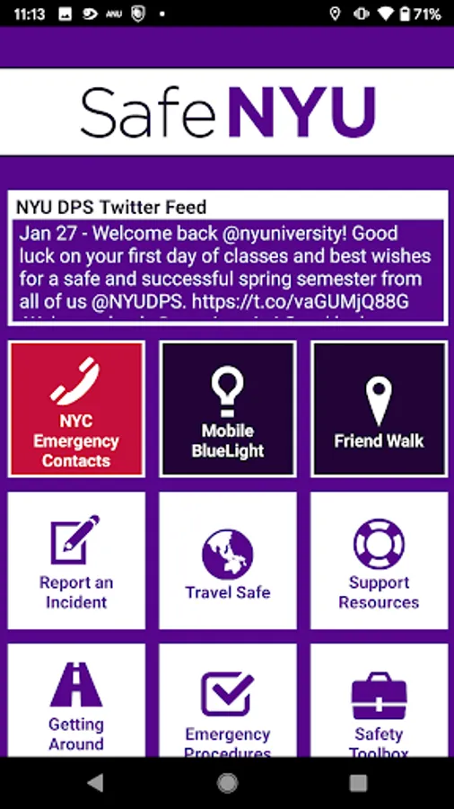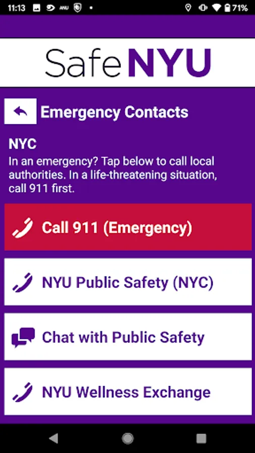 Safe NYU is the official safety app of New York University. Safe NYU integrates closely with NYU's safety and security systems. NYU Public Safety has worked to develop a unique app that provides students, faculty and staff with added safety on NYU campuses. The app will send you important safety alerts and provide instant access to campus safety resources.