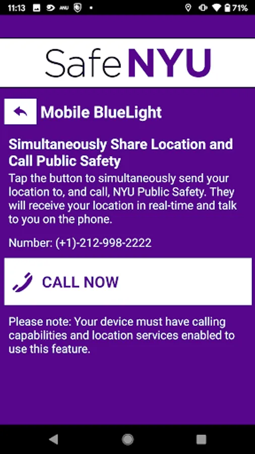 - Mobile BlueLight: Send your location to NYU Public Safety in real-time in case of a crisis