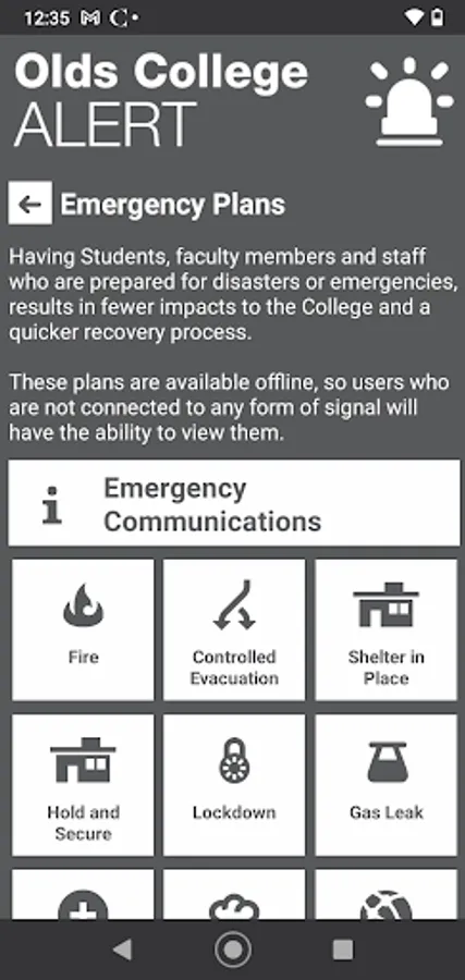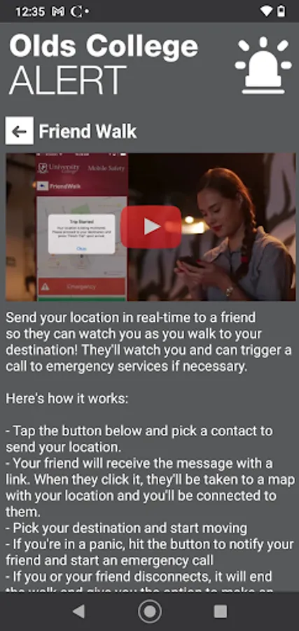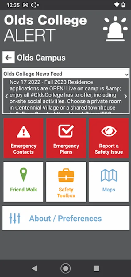 Olds College Alert is the official safety app of Olds College. It is the only app that integrates with Olds College's safety and security systems. Olds College Health Safety and Security department has worked to develop a unique app that provides students, faculty and staff with added safety on the Olds College campus. The app will send you important safety alerts and provide instant access to campus safety resources.