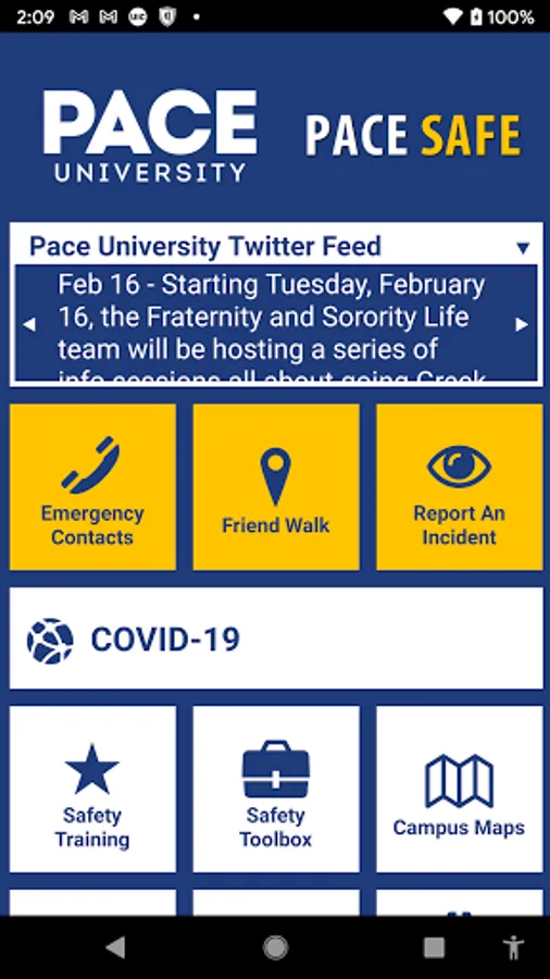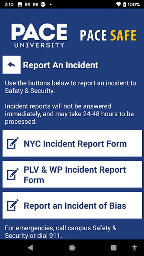 - Incident Reporting: Multiple ways to report a safety/security concern directly to Pace University security.