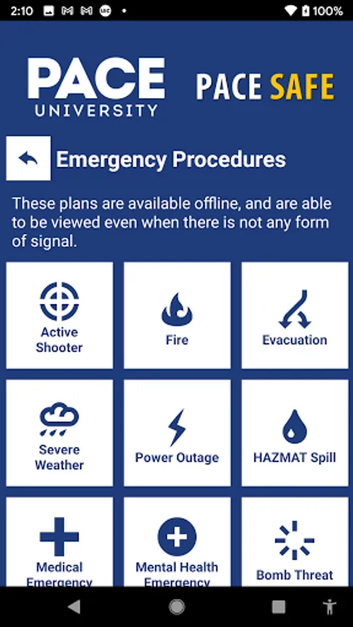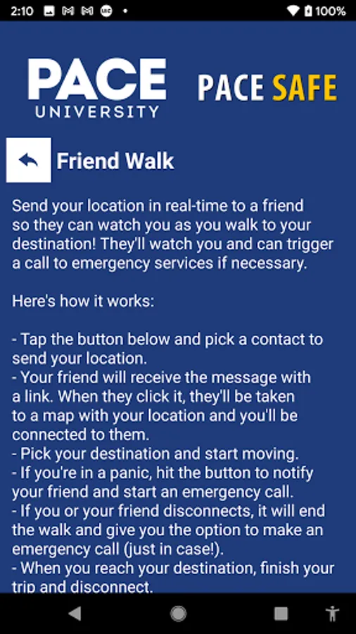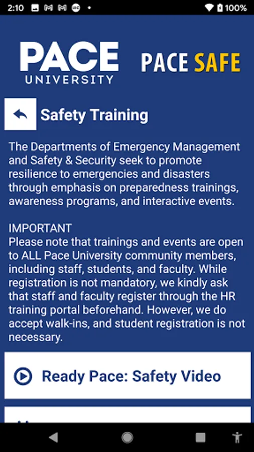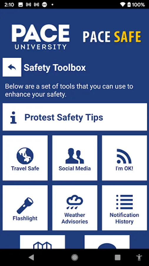 Pace Safe is the official safety app of Pace University. It is the only app that integrates with Pace University's safety and security systems. Safety & Security has worked to develop a unique app that provides students, faculty and staff with added safety on the Pace University campus. The app will send you important safety alerts and provide instant access to campus safety resources.