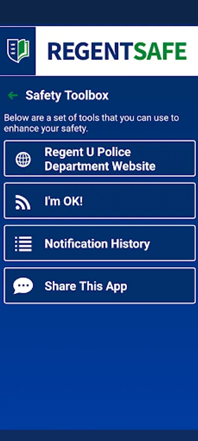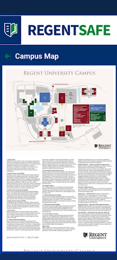 Regent Safe is the official safety app of Regent University. It is the only app that integrates with Regent University's safety and security systems. University Police have worked to develop a unique app that provides students, faculty and staff with added safety on the Regent University campus. The app will send you important safety alerts and provide instant access to campus safety resources.