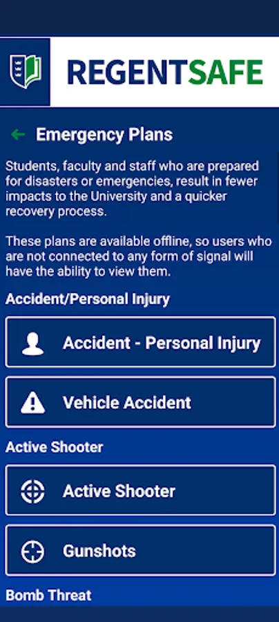 - Emergency Plans: Campus emergency documentation that can prepare you for disasters or emergencies. This can be accessed even when users aren’t connected to Wi-Fi or cellular data.
