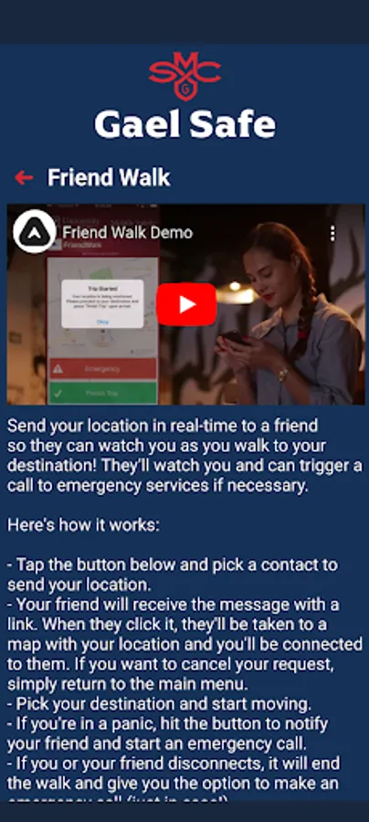 Gael Safe is the official safety app of Saint Mary's College of California. It is the only app that integrates with Saint Mary's College of California's safety and security systems. Campus Security has worked to develop a unique app that provides students, faculty and staff with added safety on the Saint Mary's College of California campus. The app will send you important safety alerts and provide instant access to campus safety resources.