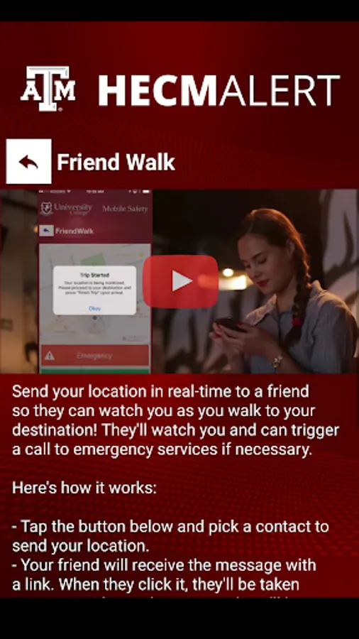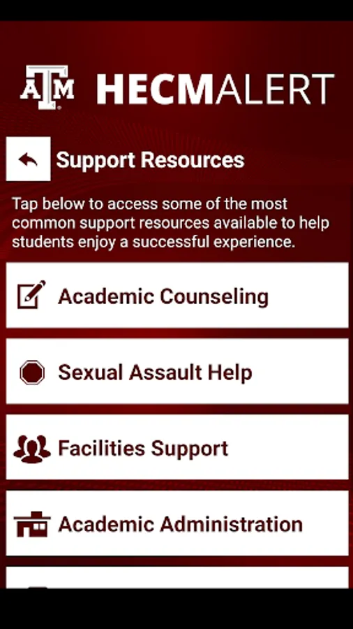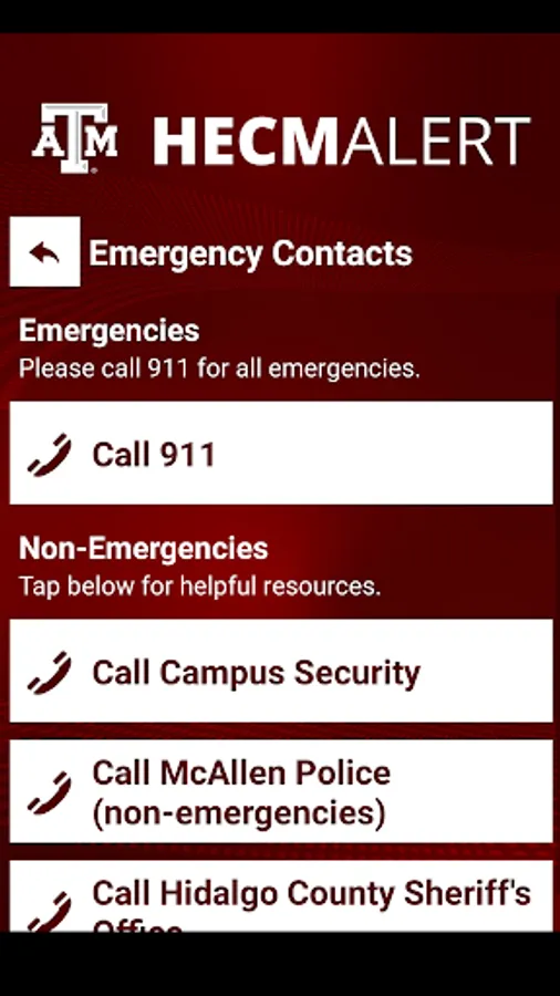 HECM Alert is the official safety app of Texas A&M Higher Education Center at McAllen. It is the only app that integrates with Texas A&M Higher Education Center at McAllen's safety and security systems.This is a unique app that provides students, faculty and staff with added safety at the Texas A&M Higher Education Center at McAllen. The app will send you important safety alerts and provide instant access to campus safety resources.
