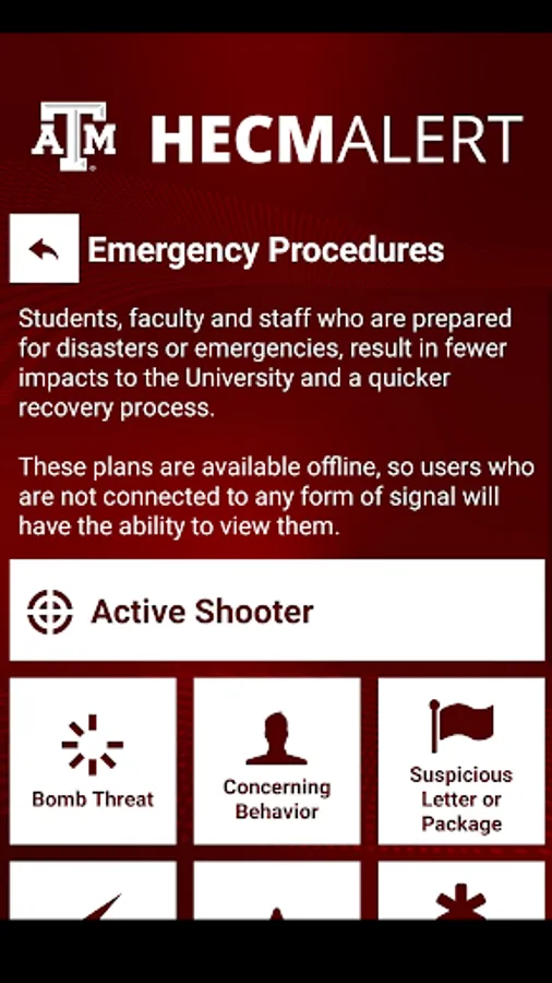 - Emergency Procedures: Campus emergency documentation that can prepare you for disasters or emergencies. This can be accessed even when users aren’t connected to Wi-Fi or cellular data.