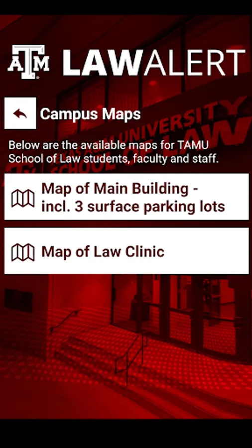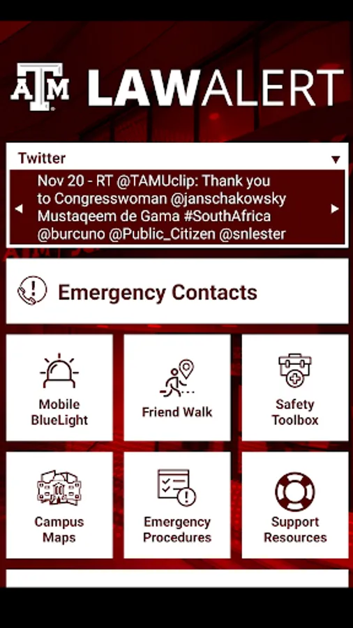 Law Alert is the official safety app of Texas A&M University School of Law. It is the only app that integrates with Texas A&M University School of Law's safety and security systems. This is a unique app that provides students, faculty and staff with added safety on the Texas A&M University School of Law campus. The app will send you important safety alerts and provide instant access to campus safety resources.