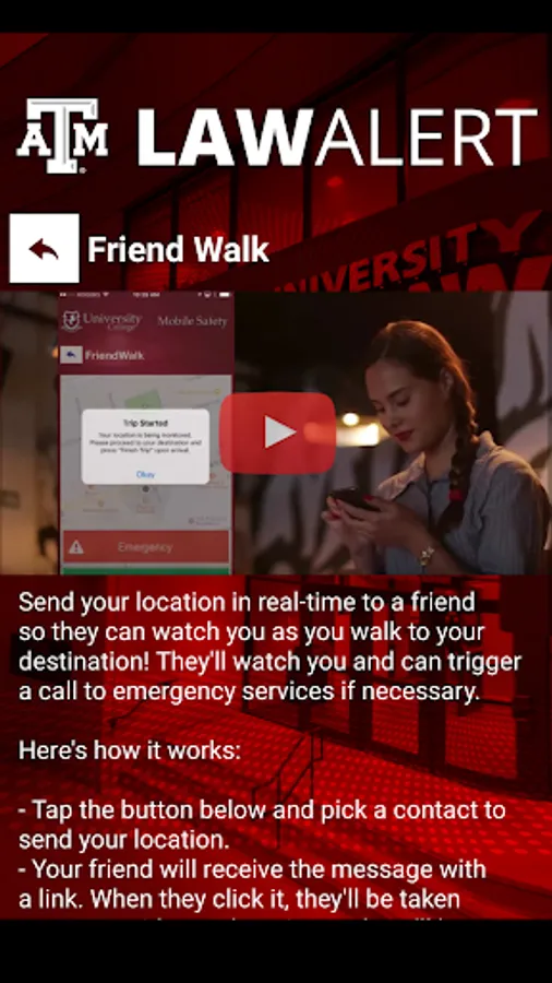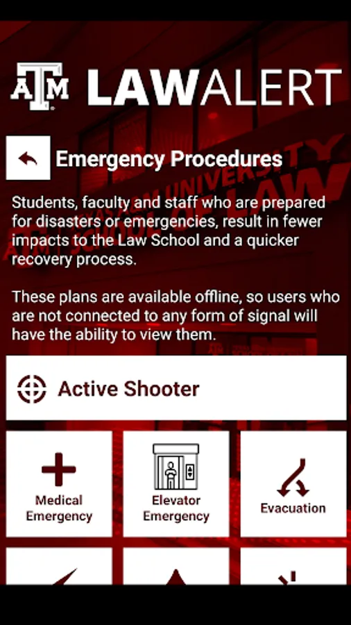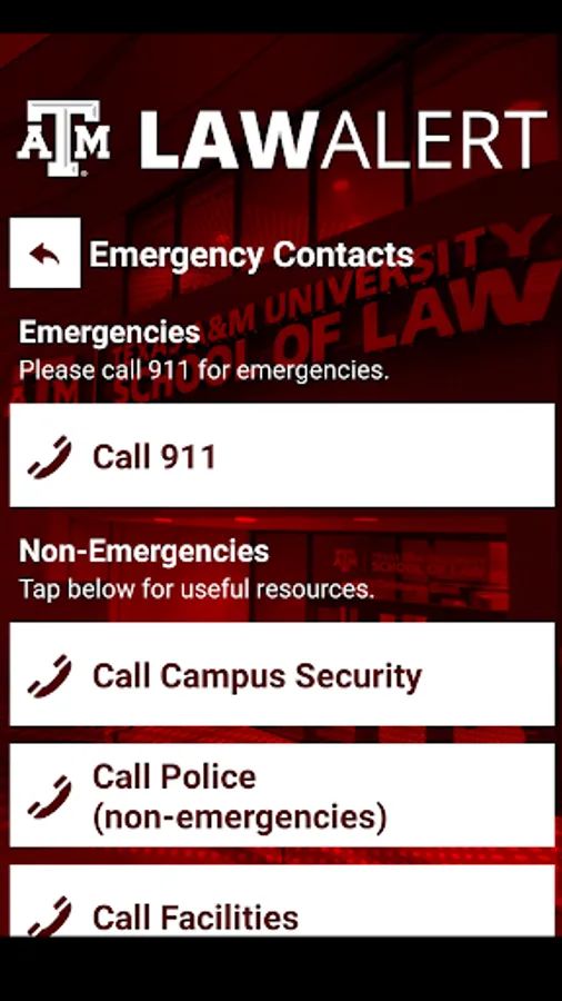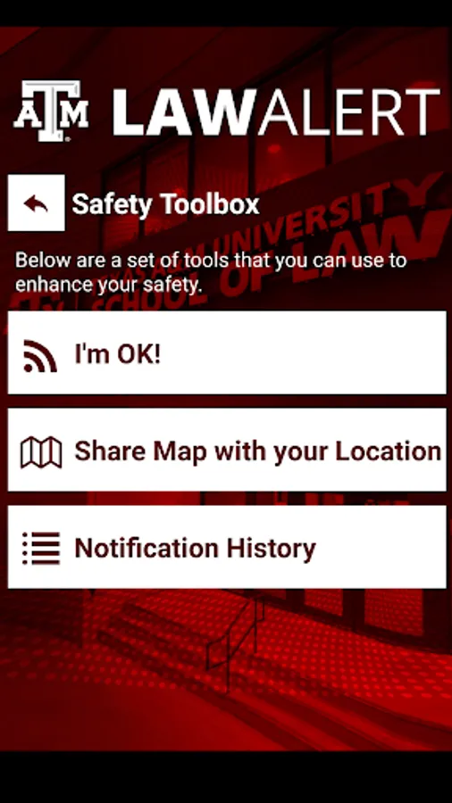 - Safety Notifications: Receive instant notifications and instructions from Texas A&M University School of Law safety when on-campus emergencies occur.