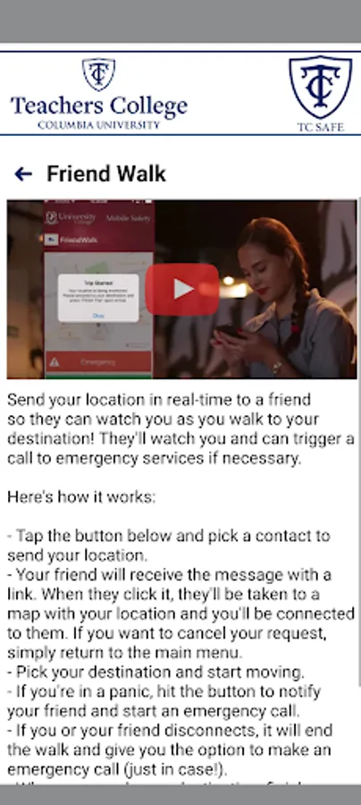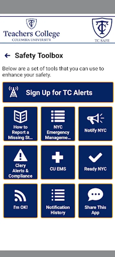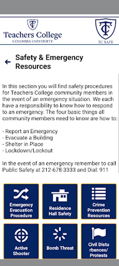 - Safety Notifications: Receive instant notifications and instructions from Teachers College, Columbia University safety when on-campus emergencies occur.