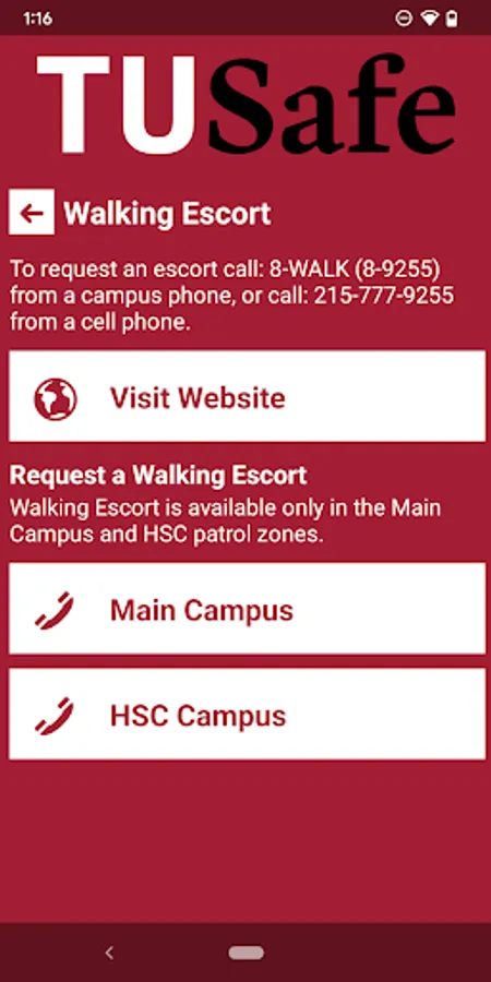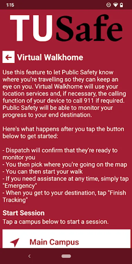 - Virtual WalkHome: Allow Campus Security to monitor a user’s walk. If a user feels unsafe when walking on campus, they can request a Virtual WalkHome and a dispatcher on the other end will monitor their journey until they reach their destination.