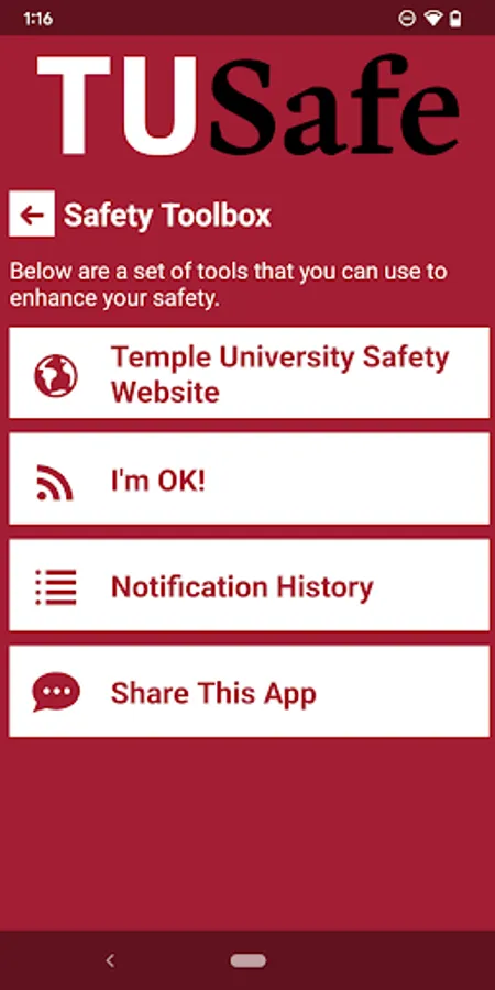 TUSafe is the official safety app of Temple University. It is the only app that integrates with Temple University's safety and security systems. Public Safety has worked to develop a unique app that provides students, faculty and staff with added safety on the Temple University campus. The app will send you important safety alerts and provide instant access to campus safety resources.