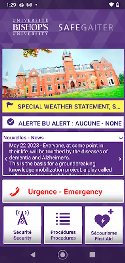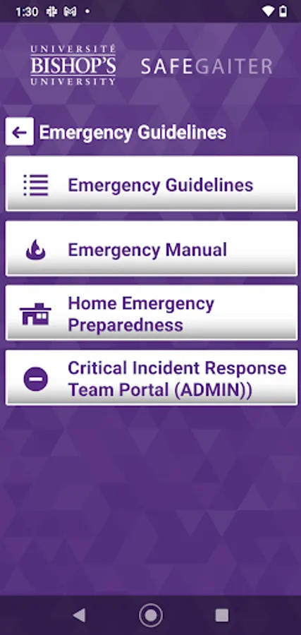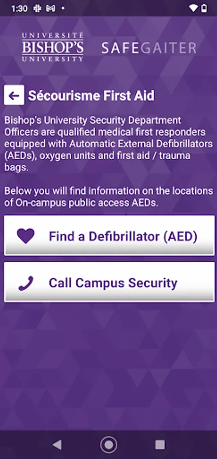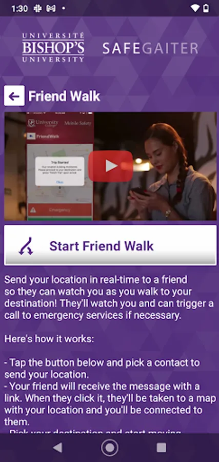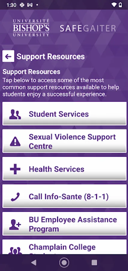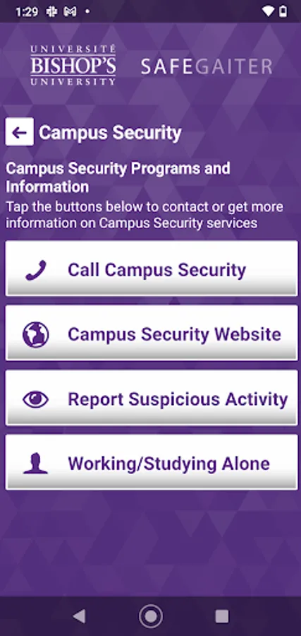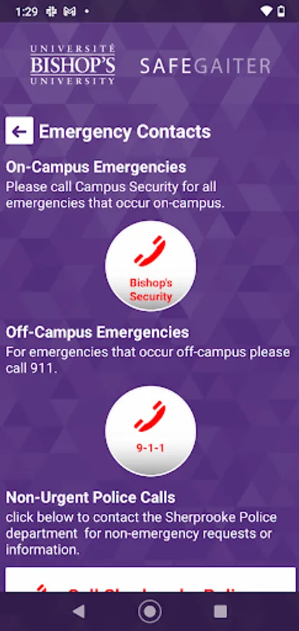 SAFEGaiter is a mobile safety app developed for our students, staff, faculty & visitors at Bishop's University. The app provides fast & easy access to campus security services, emergency guidelines & alerts, campus maps, personal support resources, safety tips, tools & more! This app was developed with direction from Bishop's University’s Human Resources and Security departments.