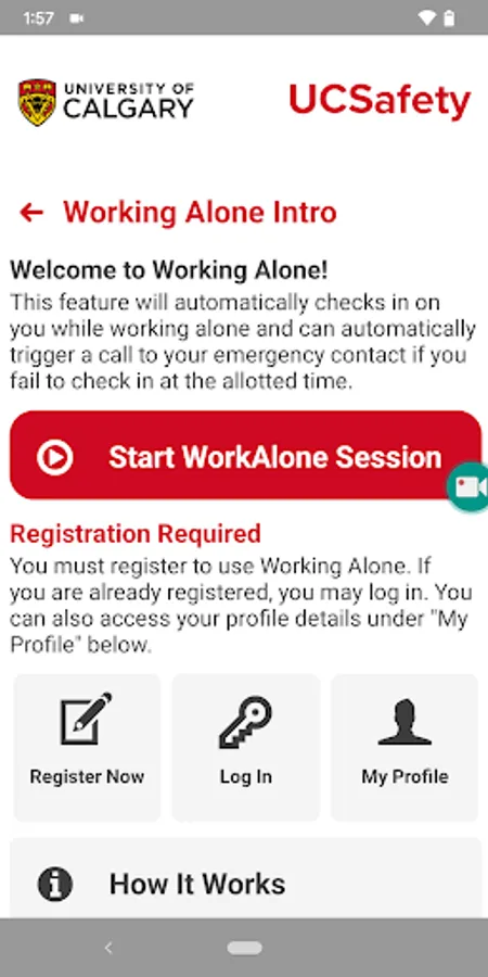 - WorkAlone: Use the app to "check in" with you periodically while working alone or during late hours. If you don't respond, the app will alert Campus Security.