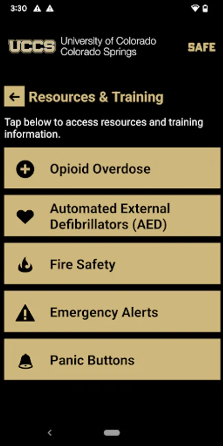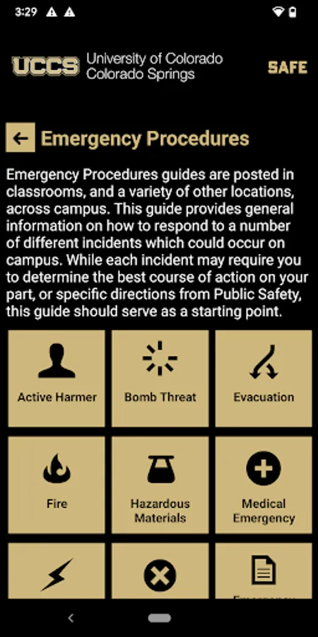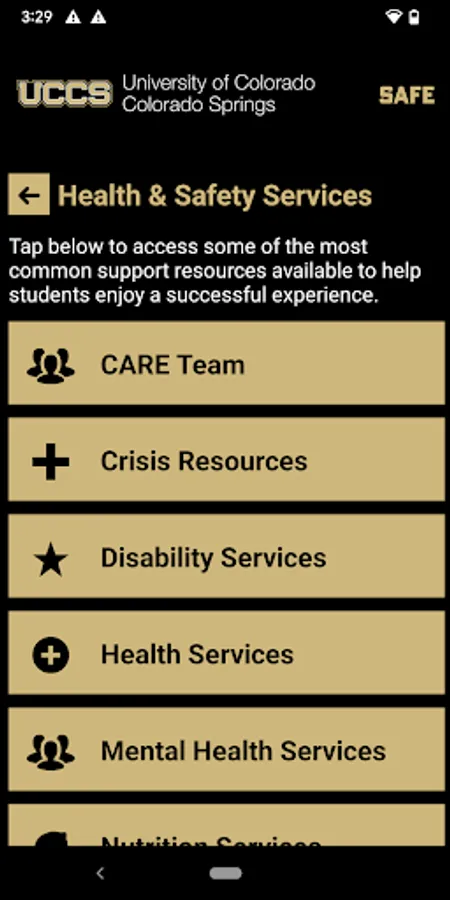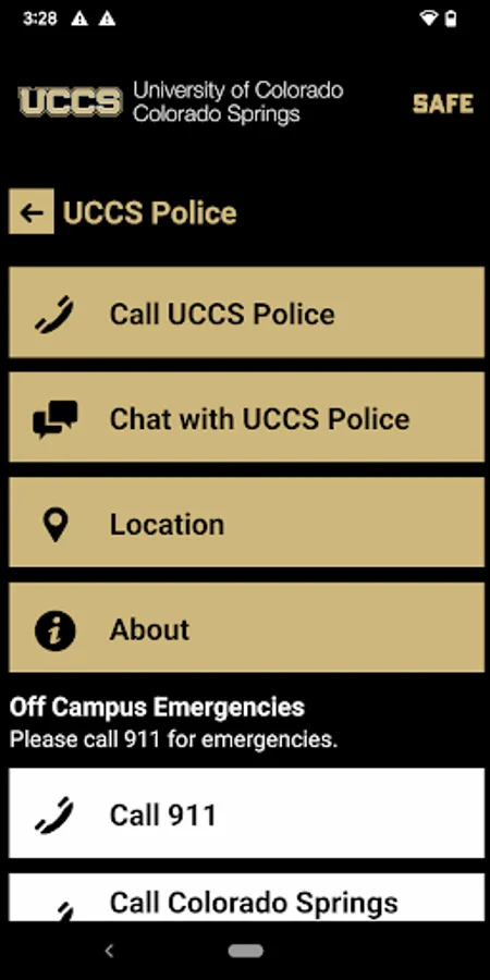 UCCS SAFE is the official safety app of University of Colorado - Colorado Springs. It is the only app that integrates with University of Colorado - Colorado Springs's safety and security systems. UCCS Police has worked to develop a unique app that provides students, faculty and staff with added safety on the University of Colorado - Colorado Springs campus. The app will send you important safety alerts and provide instant access to campus safety resources.