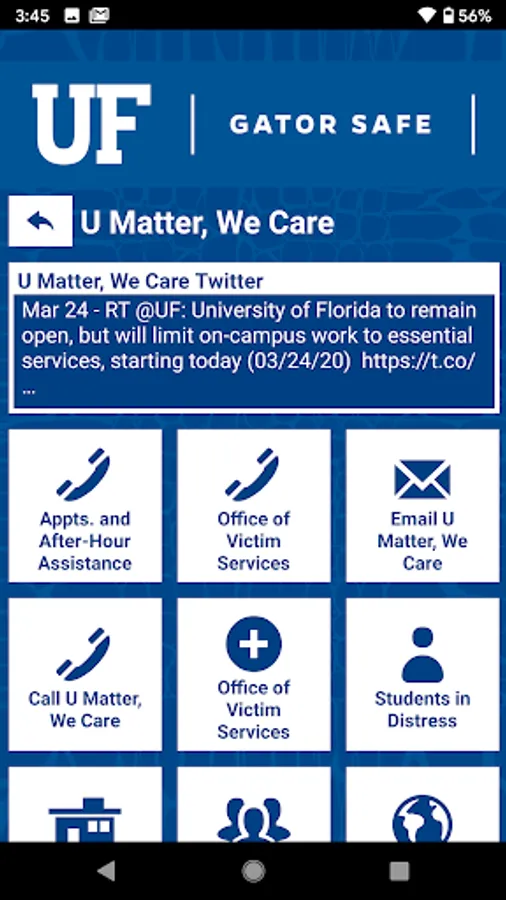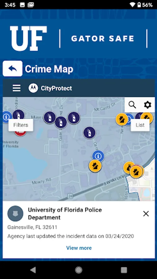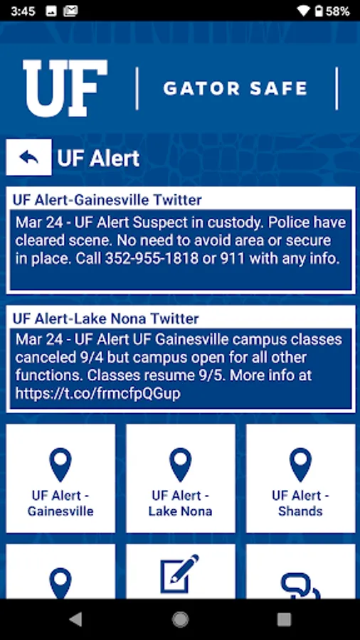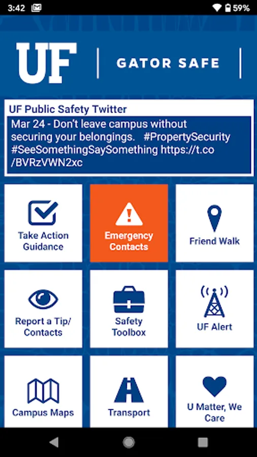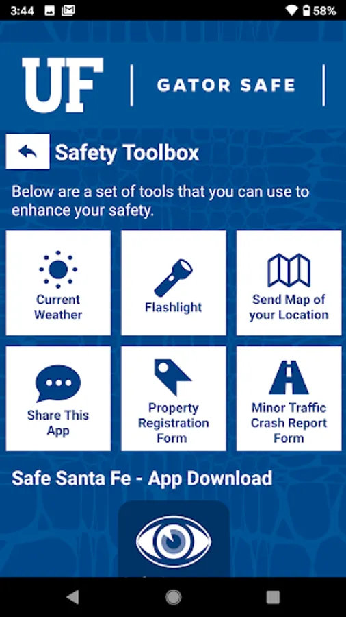 GATOR SAFE is the official safety app of University of Florida. The University of Florida Police Department has worked to develop a unique app that provides students, faculty and staff with added safety on the UF campus. The app will send you important safety alerts and provide instant access to campus safety resources.