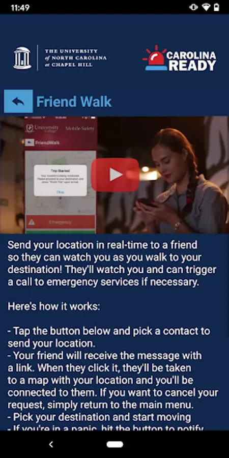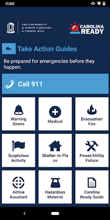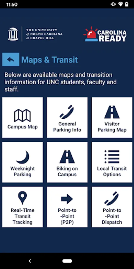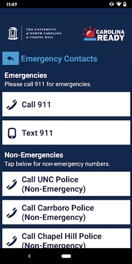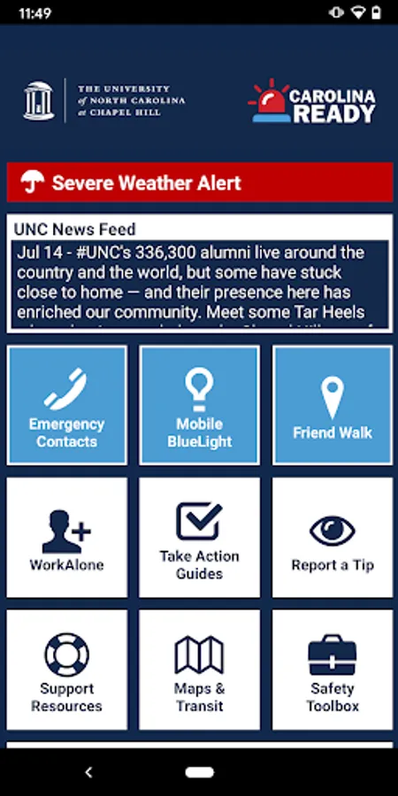 UNC Carolina Ready Safety is the official safety app of University of North Carolina at Chapel Hill. It is the only app that integrates with University of North Carolina at Chapel Hill's safety and security systems. UNC Police has worked to develop a unique app that provides students, faculty and staff with added safety on the University of North Carolina at Chapel Hill campus. The app will send you important safety alerts and provide instant access to campus safety resources.