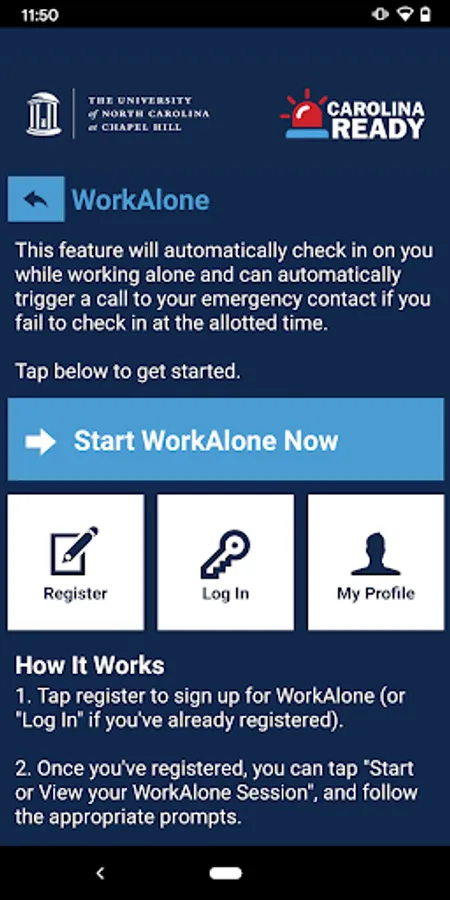 - WorkAlone: Use the app to "check in" with you periodically while working alone or during late hours. If you don't respond, the app will alert your emergency contact.