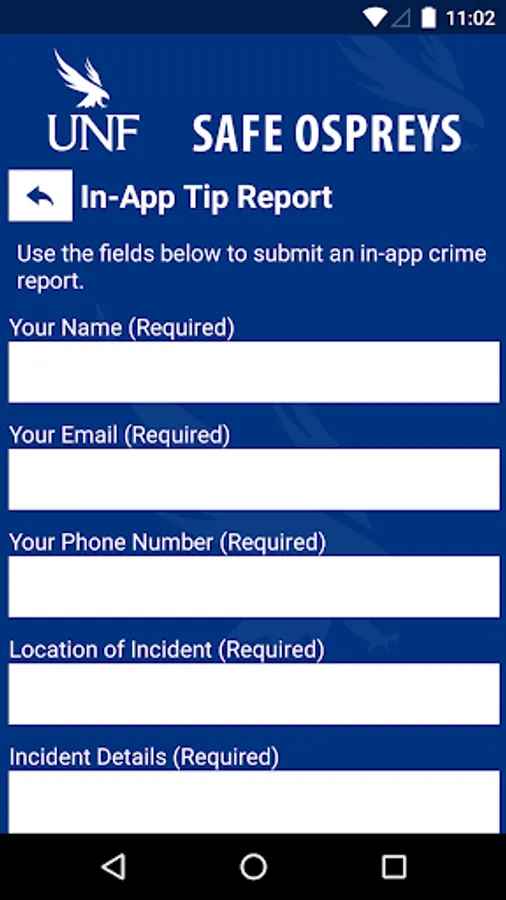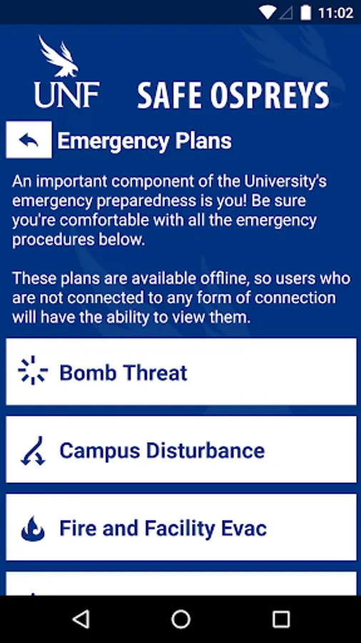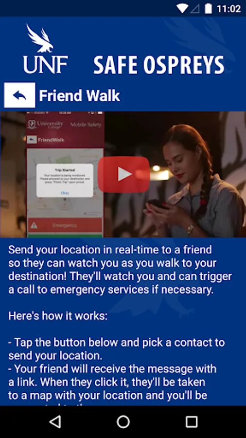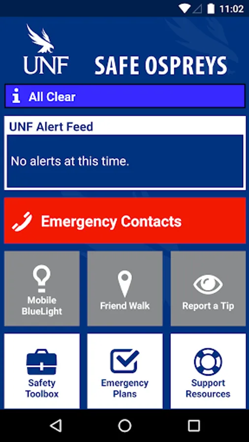 Safe Ospreys is the official safety app of University of North Florida. It is the only app that integrates with UNF’s safety and security systems. UNF Police Department has worked to develop a unique app that provides students, faculty and staff with added safety on the UNF campus. The app will send you important safety alerts and provide instant access to campus safety resources.