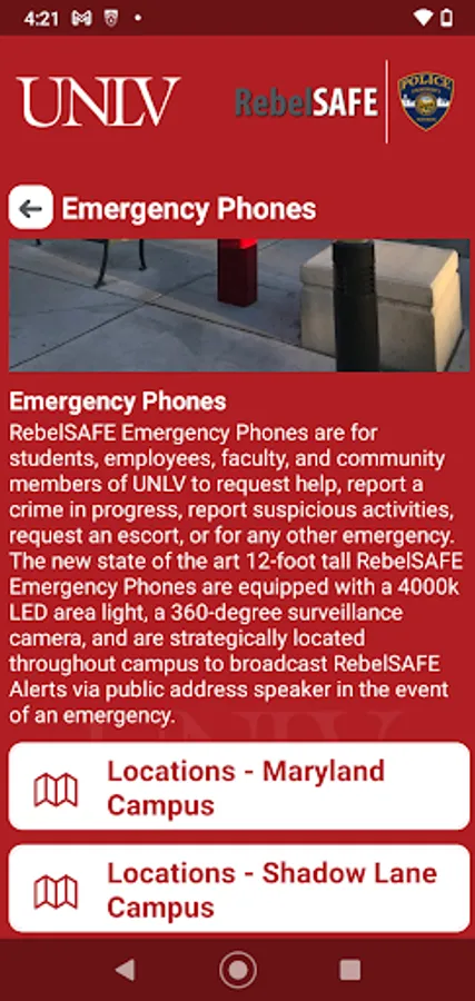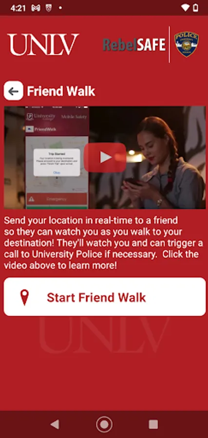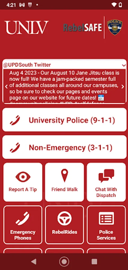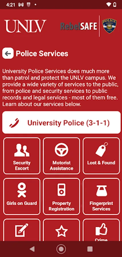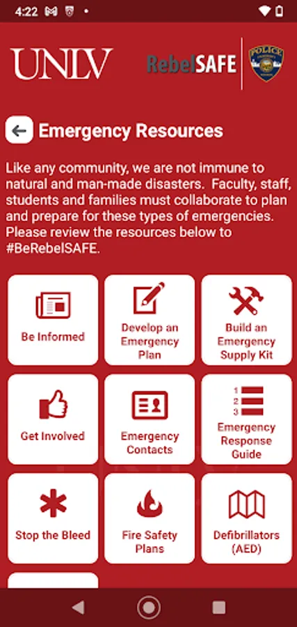 RebelSAFE is the official safety app of University of Nevada, Las Vegas. It is the only app that integrates with UNLV's safety and security systems. Police Services has worked to develop a unique app that provides students, faculty and staff with added safety on the University of Nevada, Las Vegas campus. The app will send you important safety alerts and provide instant access to campus safety resources.