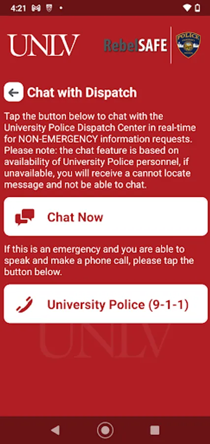 - Chat with Security: Communicate live with safety staff at UNLV via chat.