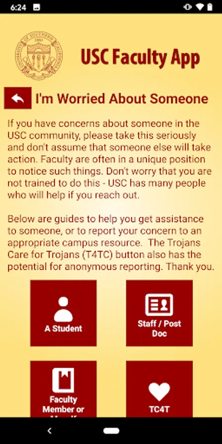 - I'm Worried About Someone: Multiple ways to report a safety/security concern directly to USC security or the appropriate departments.