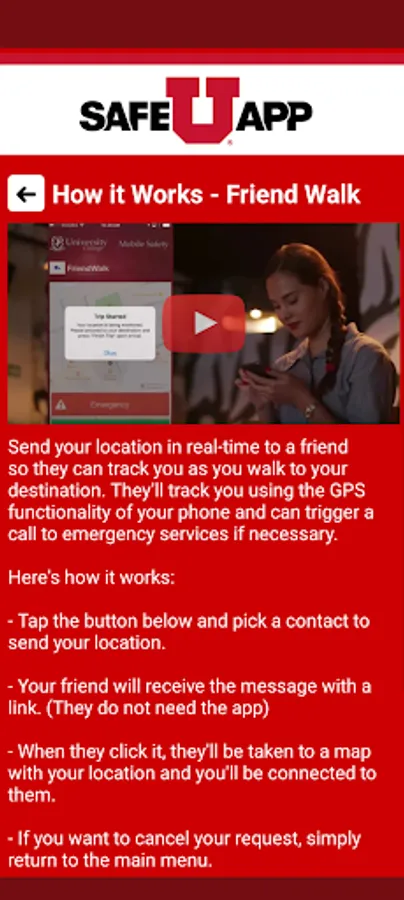 - Friend Walk: Send your location to a friend through email or SMS on your device. Once the friend accepts the Friend Walk request, the user picks their destination and their friend tracks their location in real time; they can keep an eye on them to make sure they make it safely to their destination.
