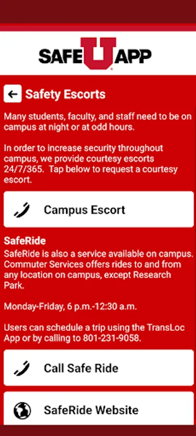 SafeU is the official safety app of The University of Utah. It is the only app that integrates with The University of Utah's safety and security systems. The app will send you important safety alerts and provide instant access to campus safety resources.