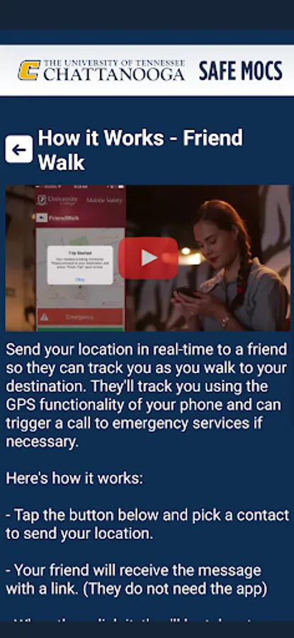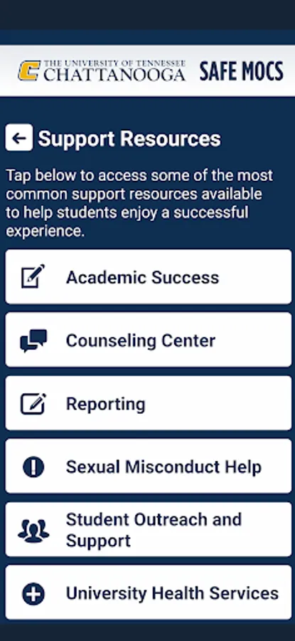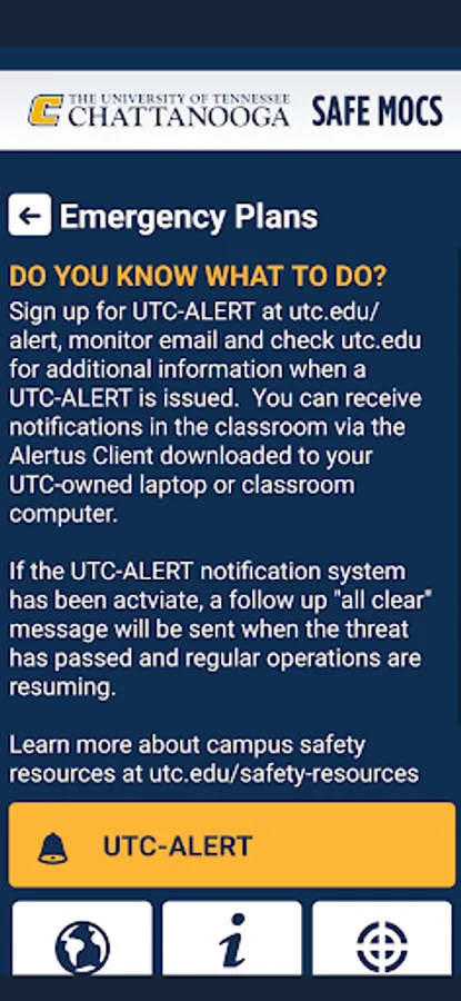 Safe Mocs is the official safety app of University of Tennessee at Chattanooga. It is the only app that integrates with University of Tennessee at Chattanooga's safety and security systems. The app will send you important safety alerts and provide instant access to campus safety resources.