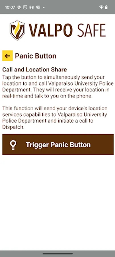 - Panic Button / Mobile Bluelight: Send your location to Valparaiso University security in real-time in case of a crisis